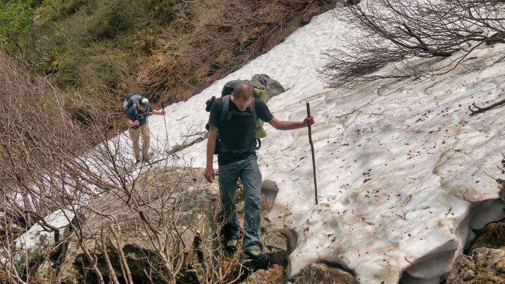 The third day was about us, now rested Bochetta di Terza to lead. In order to get there, we climbed and slid for less than an hour and 300 vertical meters lower, in order to find the path down below that would take us over the pass. It was still unclear whether the snowfields below the 1836 m high pass would be across. We agreed unanimously that we would not risk and turn back if it became too risky. Secretly, however, it was also clear to everyone that this decision would no longer take place uninfluenced after 900 meters ascent.