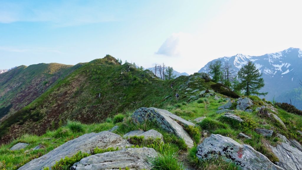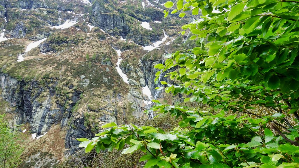 After three hours, the 900 meters were made, the snow fields were, let's say, feasible. Fortunately, the snow was already pretty soft, so it was easy to kick. In the upper, but quite steep snowfield, slipping would certainly not have gone well. At the top we rested with gusts of wind, cereal bars and occasional raindrops. The further descent to Alpe Pian di Boit at 1120m tidy, especially the last half through the forest is steep and uncomfortable. The paths in the forest are completely covered with deep foliage, which extends into hollows and depressions to the middle of the lower leg. As a result, stones on the way are no longer visible and you feel and stumble carefully piece by piece deeper. But that was done after another two hours and 850 meters altitude.