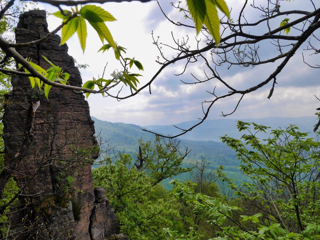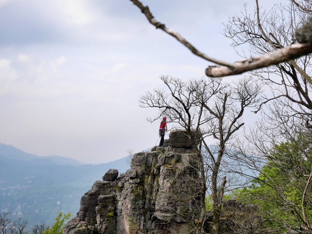 The picturesque rocky needles meandering through the canopy, as well as the very own climbing on the horizontally striped porphyry conglomerate, and last but not least the easy access via the upper and lower rock path, make the climbing area one of the most beautiful in Germany. The hedging with bolts is rather bold to call, especially in the lower levels of difficulty you put back many climbing meters, until finally a Bühler comes along. Up to the respective exit one can get rid however usually of its complete supply of loops, wedges and friends without further ado. It climbs so much easier, if you are not flashing and flashing, hanging like a Christmas tree, on the way.
