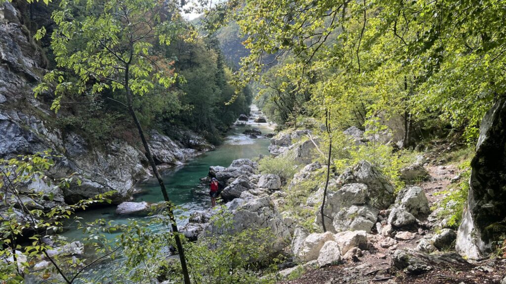 Von Trenta aus führt der Weg nach Bovec, einer Strecke, die weniger anspruchsvoll ist, aber immer noch eine gute Grundkondition erfordert. Der Weg schlängelt sich entlang des Soča-Flusses, durch die berühmte Soča-Schlucht, und bietet dabei spektakuläre Ausblicke auf das türkisfarbene Wasser und die umliegenden Wälder. Diese Etappe ist ein wahres Paradies für Naturliebhaber.