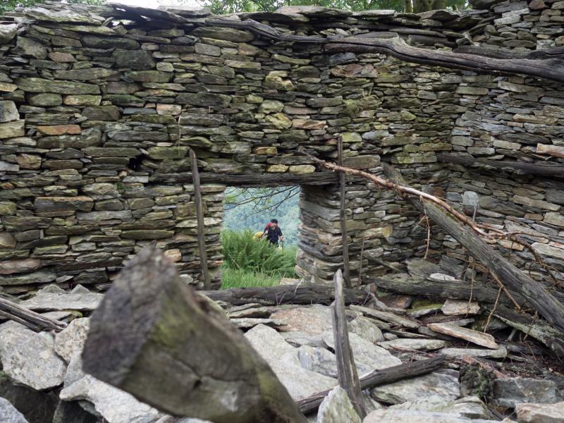 Nun stehen wir im leicht nebeligen Cicogna, richten uns und unsere Rucksäcke her und steigen zum Fluß ab. Der Weg ist glitschig und tatsächlich legt sich der erste Wanderer unserer Sechsergruppe erst einmal hin. Mit einem leicht verbogenem Teleskopstock starten wir also die Tour. Die Kühle des Flusses hinter uns lassend, steigen wir auf der anderen Seite auf. Es ist plötzlich schwül, jedes Schwitzen ist vergeblich. Immer weiter, immer steiler steigen und schnaufen wir, kein Stück flachen Weges bietet Erholung. Die Gruppe zieht sich auseinander, die Abstände verkürzen sich wieder. Alte, zerfallene Häuser aus rohem Stein, der dunkle, tropfende Wald, Stille.