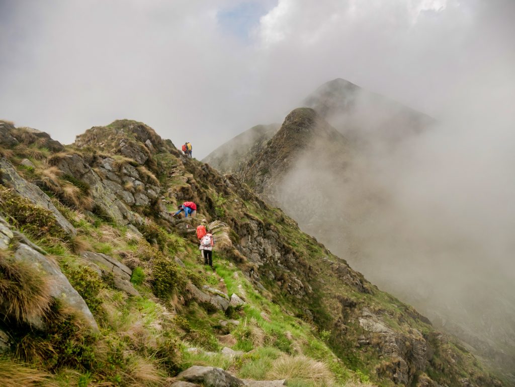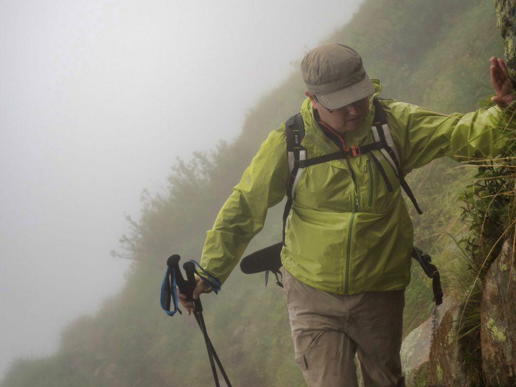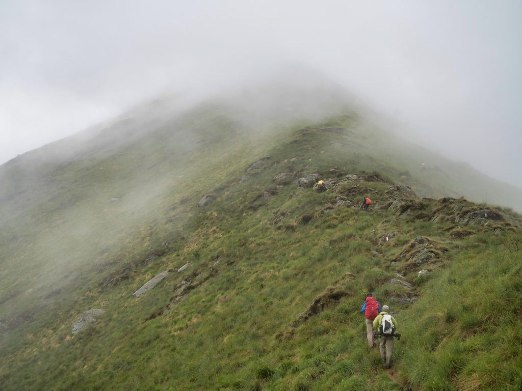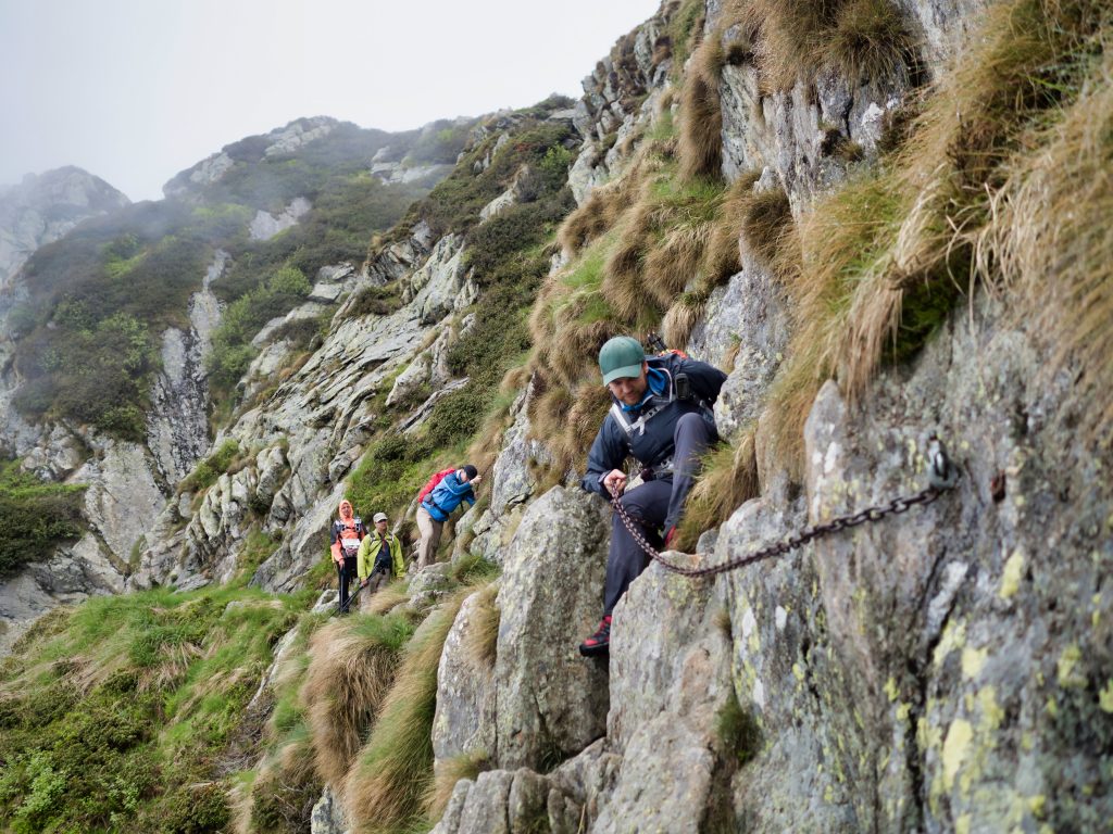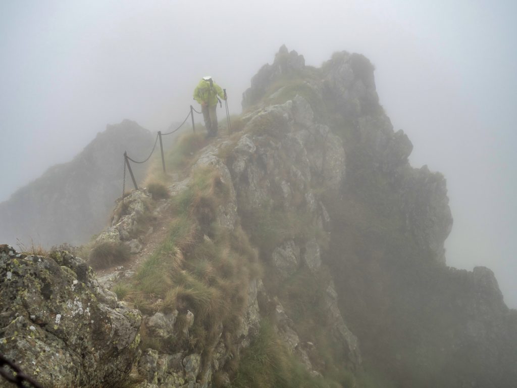 Ein weniger erfahrener Mitwanderer stöhnt und flucht: er hat Höhenangst. Meinen Kommentar, dass es dann doch ganz gut sei, dass man nichts sieht, kommentiert er, zugegeben zurecht, barsch. Wir bugsieren ihn über die riskanteren Stellen, helfen wo wir können. Ich bin hin und hergerissen. Wir müssen schnellstens vom Grat runter, das Donnergrollen ist direkt über uns – und wir sind immer noch auf dem Grat, überall hängen aus der Wand gerissene Sicherungsketten. Aber einen verängstigten Wanderer anzutreiben kann in diesem Gelände riskant sein. Er spürt den Druck schon selbst, und er kämpft sich durch. Langsam zwar, aber stetig. Respekt vor dieser Leistung, nicht wenige hätten sich wohl hingesetzt und geweint, er kommentiert trocken: “Das ist ja wohl kein Wandern mehr, das ist doch Bergsteigen!”.