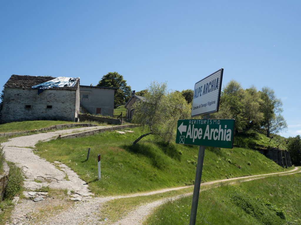 Am Bivacco Vada genießen wir kühles, frisches Wasser aus dem Brunnen und füllen unsere Flaschen nach. Ab jetzt geht es sanft fallen und gut ausgebaut auf einem alten Militärweg bergab. Weiter unten rasten wir im Schatten und gehen weiter zur Alpe Archia. Es ist früher Nachmittag, Archia ist ein Ökobauernhof mit Übernachtungsmöglichkeit und Restaurant und damit unser sehnlich erwartetes Ziel für den Tag. Jedoch müssen wir feststellen, dass die Alpe Archia geschlossen ist. Es gibt wenig zu debattieren, zwischen hier und dem Ziel unserer Wanderung, dem Örtchen Manegra, gibt es keine offenen Hütten mehr.