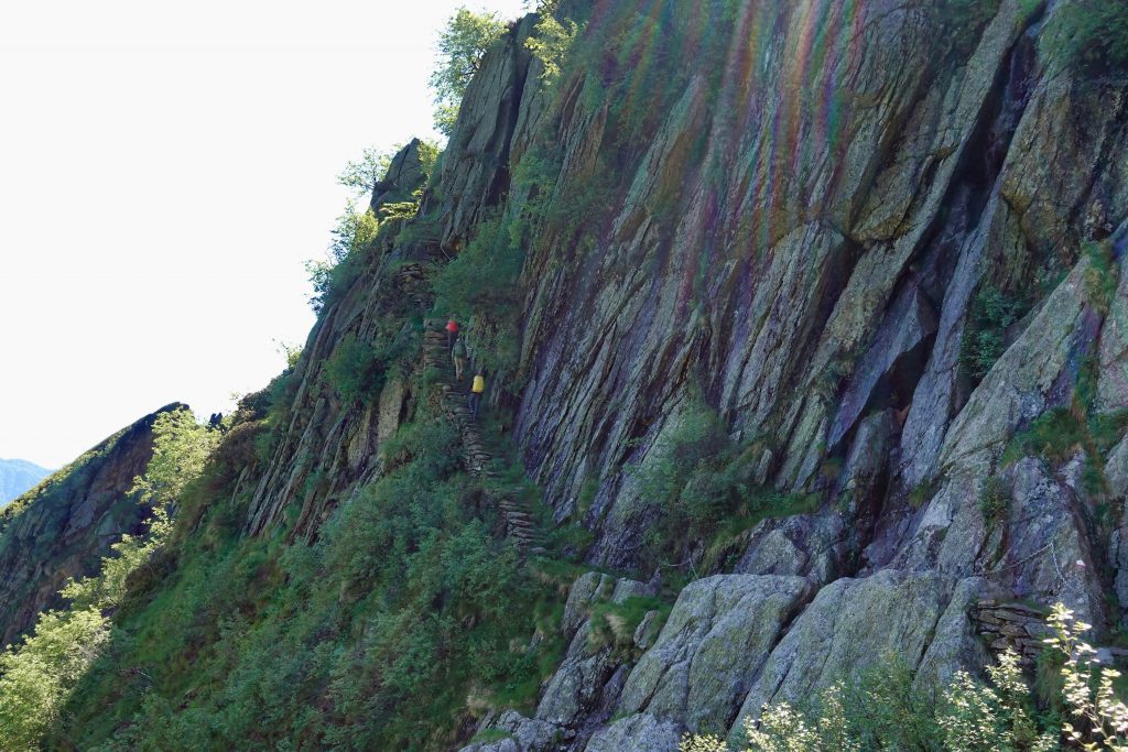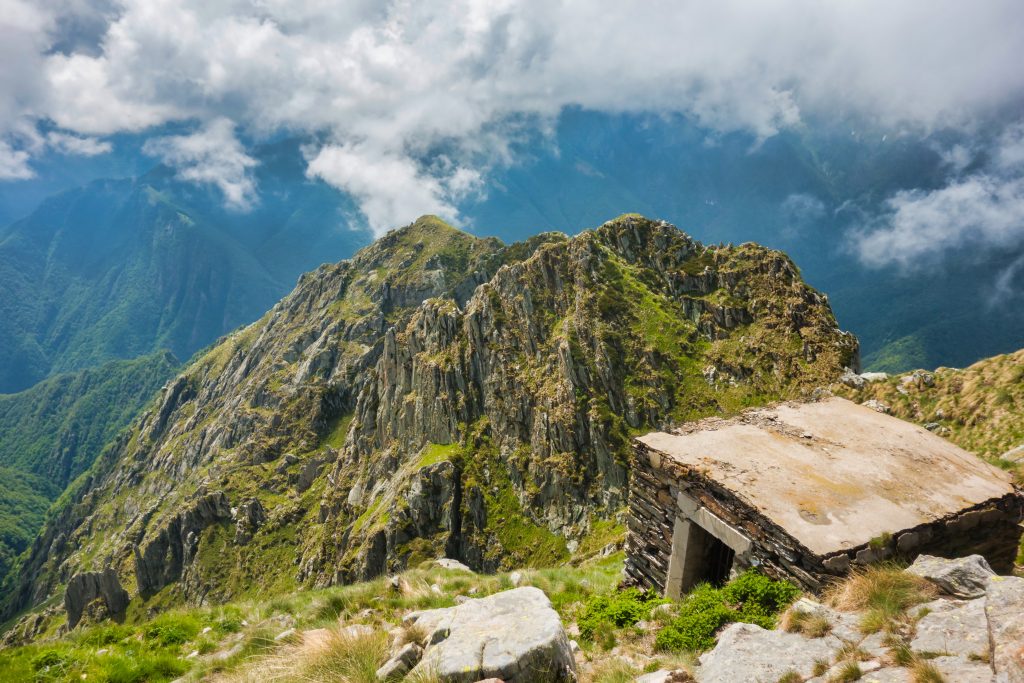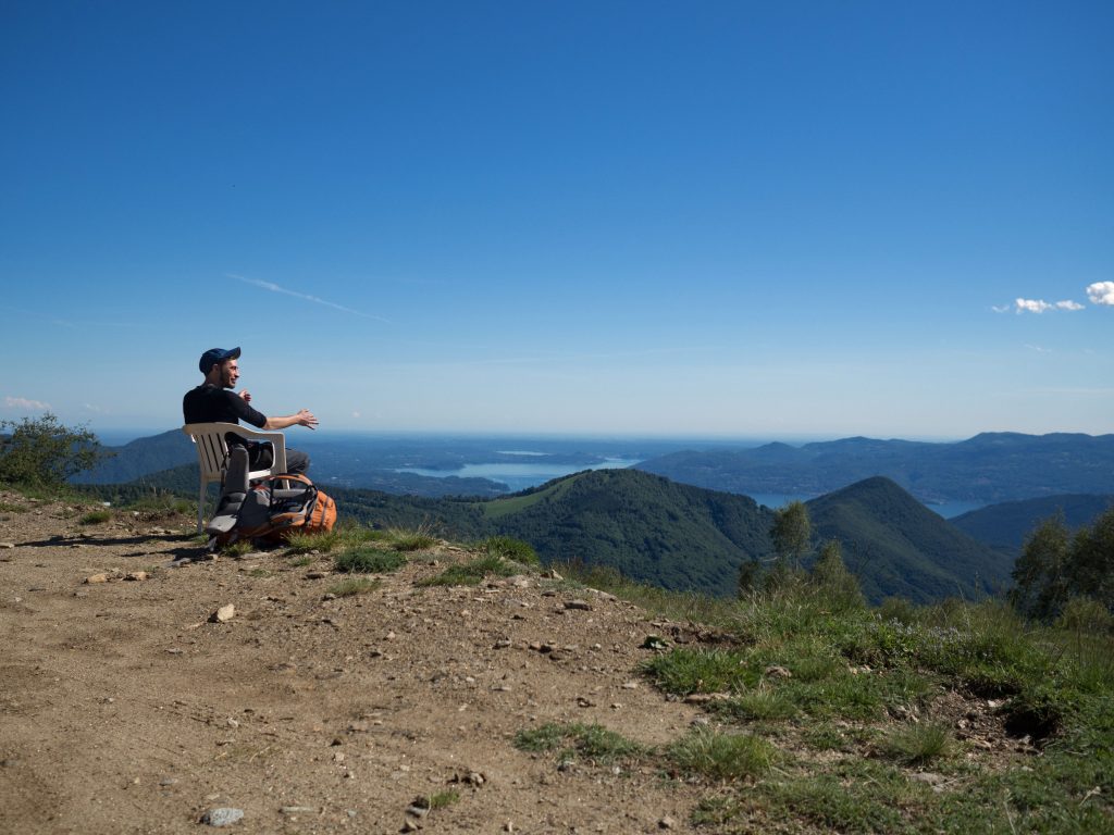 Kurzentschlossen hängen wir die morgige, letzte Etappe noch dran und latschen los. Um diese letzten 13 Kilometer noch vor Einbruch der Dunkelheit zu schaffen, drücken wir auf’s Wandergaspedal. Wir lassen Il Colle hinter uns und kommen zu Cima di Morissolo. Diese steil über den Lago Maggiore aufragende Klippe ist durchlöchert, war doch hier ein altes Munitionslager. Eine kurze Erkundungtour später marschieren wir durch bis Piancavallo, wo dankenswerterweise noch ein Espresso für mich und Bier und Cola für die Anderen drin ist. Die kleine Bar schließt, nachdem wir ausgetrunken haben.