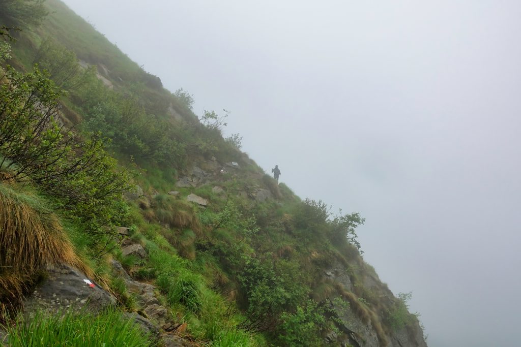 Von der Hütte weg, weiter oben, umfängt uns immer dichter werdender Nebel. Wir trotten dahin, sanft ansteigend, und machen eine kurze Pause an der Kapelle Pian Cavallone.