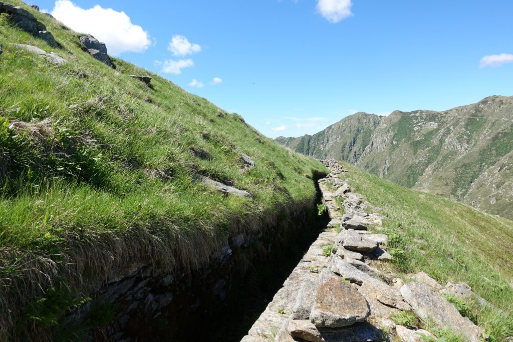 Heute ist Pausentag, nur etwa fünf Kilometer und überschaubare Höhenmeter sind zu bewältigen, und das auf gut ausgebauten, alten Militärwegen der Linea Cardorna. Über schöne Wege, hoch auf dem Bergrücken zwischen Monte Zeda und Monte Vada, geht es gemächlich dahin. Den Monte Vada nehme ich noch mit und bin überrascht: Schützengräben und Ziegen finde ich da oben. Welch ein Irrsinn, der sich in diese Welt, bis hier in ihre entlegensten Winkel hinein, gefressen hat.