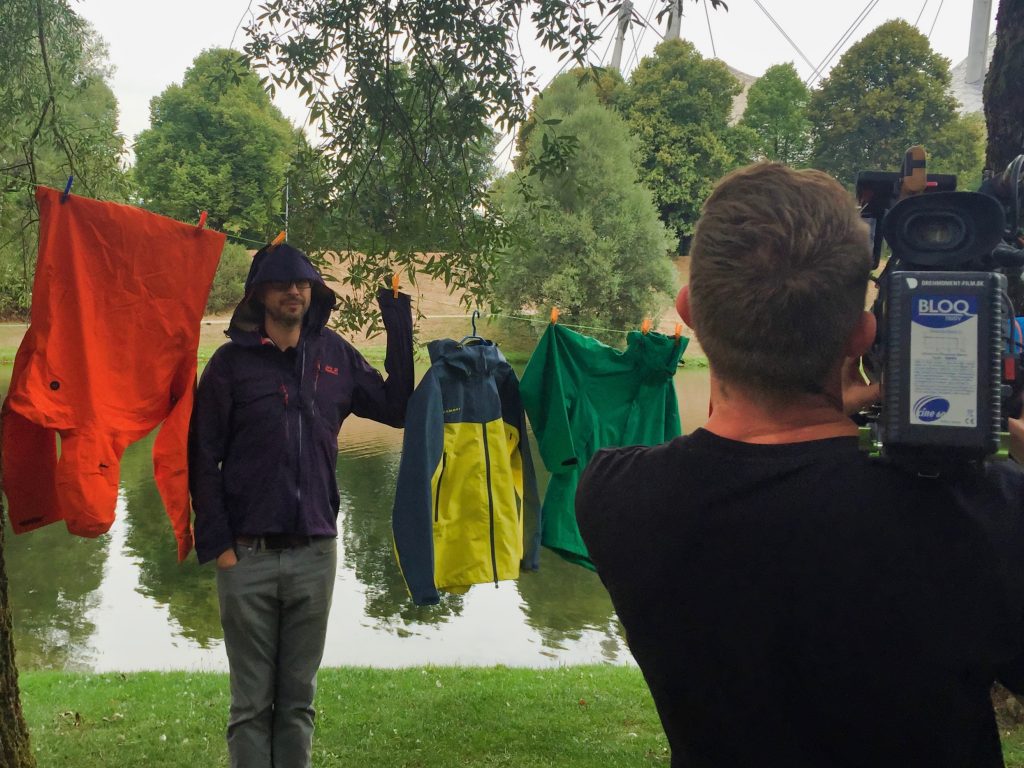 Solche Beiträge werden nicht sequentiell gedreht. Wir haben zum Beispiel die Regenkammer bei Globetrotter nur für den Vormittag bekommen, daher wurde dieser Teil zu erst abgedreht. Für die Profis war das kein Problem, aber ich musste mich schon anstrengen, später am Tag dann nicht zu sagen: “wie wir ja vorhin gesehen haben…” oder ähnliches. Aber das Team hat das dann wunderbar abgefangen und hatte echt eine enorme Geduld mit mir.