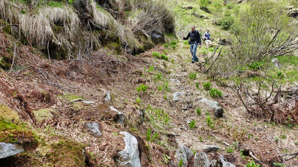 After three hours, the 900 meters were made, the snow fields were, let's say, feasible. Fortunately, the snow was already pretty soft, so it was easy to kick. In the upper, but quite steep snowfield, slipping would certainly not have gone well. At the top we rested with gusts of wind, cereal bars and occasional raindrops. The further descent to Alpe Pian di Boit at 1120m tidy, especially the last half through the forest is steep and uncomfortable. The paths in the forest are completely covered with deep foliage, which extends into hollows and depressions to the middle of the lower leg. As a result, stones on the way are no longer visible and you feel and stumble carefully piece by piece deeper. But that was done after another two hours and 850 meters altitude.