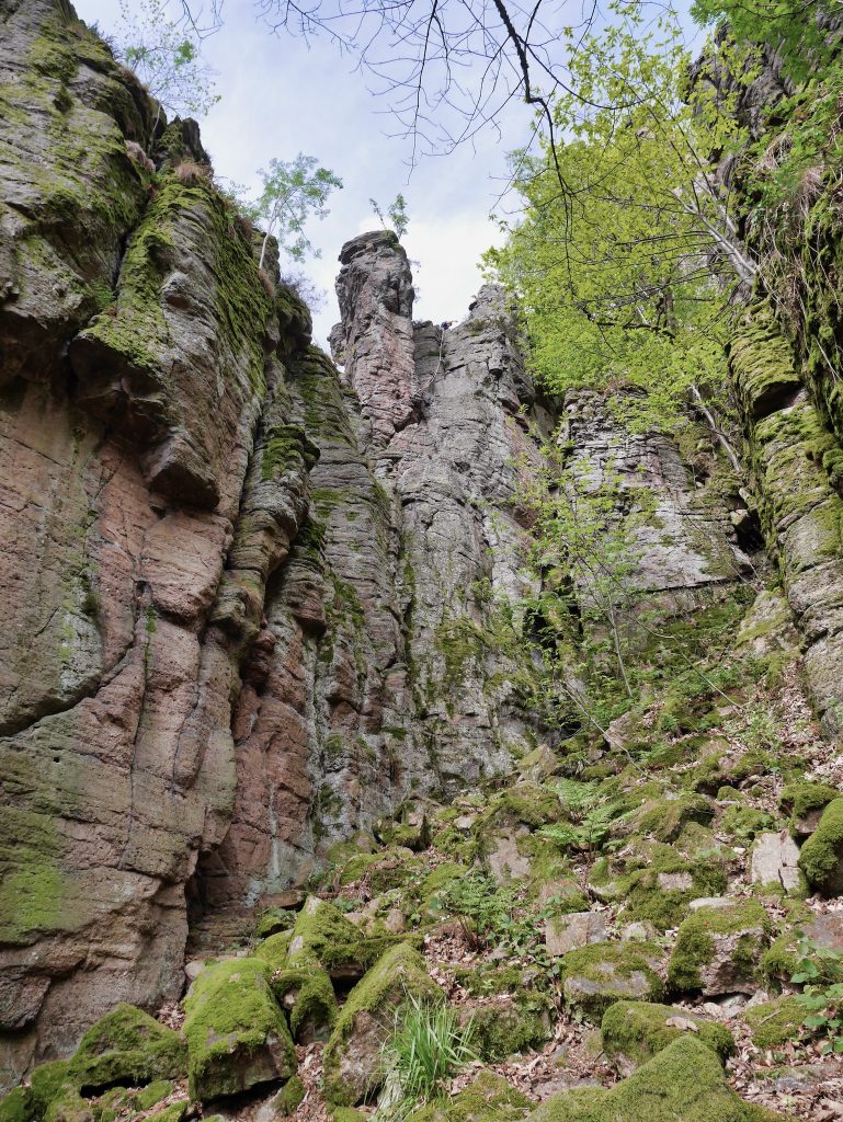The picturesque rocky needles meandering through the canopy, as well as the very own climbing on the horizontally striped porphyry conglomerate, and last but not least the easy access via the upper and lower rock path, make the climbing area one of the most beautiful in Germany. The hedging with bolts is rather bold to call, especially in the lower levels of difficulty you put back many climbing meters, until finally a Bühler comes along. Up to the respective exit one can get rid however usually of its complete supply of loops, wedges and friends without further ado. It climbs so much easier, if you are not flashing and flashing, hanging like a Christmas tree, on the way.