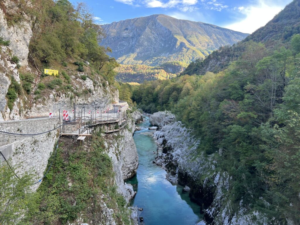 Von Trenta aus führt der Weg nach Bovec, einer Strecke, die weniger anspruchsvoll ist, aber immer noch eine gute Grundkondition erfordert. Der Weg schlängelt sich entlang des Soča-Flusses, durch die berühmte Soča-Schlucht, und bietet dabei spektakuläre Ausblicke auf das türkisfarbene Wasser und die umliegenden Wälder. Diese Etappe ist ein wahres Paradies für Naturliebhaber.