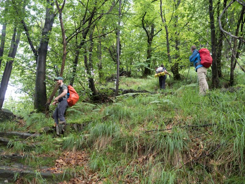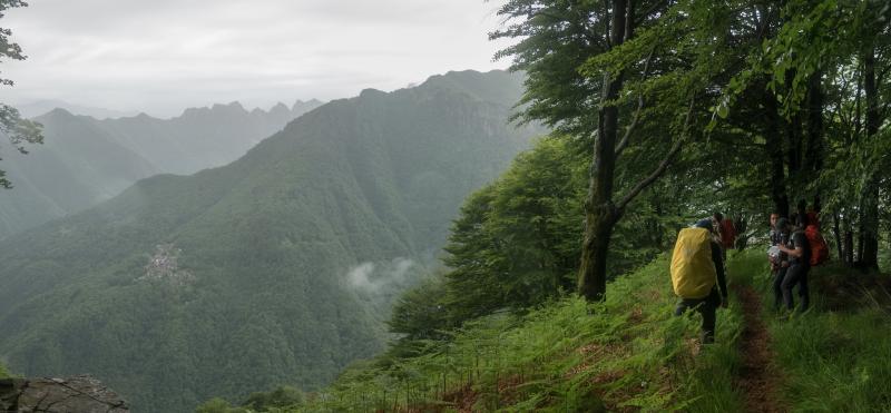 Nun stehen wir im leicht nebeligen Cicogna, richten uns und unsere Rucksäcke her und steigen zum Fluß ab. Der Weg ist glitschig und tatsächlich legt sich der erste Wanderer unserer Sechsergruppe erst einmal hin. Mit einem leicht verbogenem Teleskopstock starten wir also die Tour. Die Kühle des Flusses hinter uns lassend, steigen wir auf der anderen Seite auf. Es ist plötzlich schwül, jedes Schwitzen ist vergeblich. Immer weiter, immer steiler steigen und schnaufen wir, kein Stück flachen Weges bietet Erholung. Die Gruppe zieht sich auseinander, die Abstände verkürzen sich wieder. Alte, zerfallene Häuser aus rohem Stein, der dunkle, tropfende Wald, Stille.