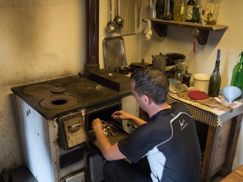 Wie hilflos man vor so einem alten, stählernen Stahlungetüm von Ofen stehen kann. Viele Öffnungen, Läden, Hebel, Schubladen – und die Beschreibung bildlich an der Wand – allerdings auf italienisch beschriftet. Irgendwie kriegen wir das Ding in Gang, der Kaffee ist fertig und wir sind komplett eingenebelt. Jemand kommt auf die Idee, den Kamin von außen zu öffnen. Wir sind uns allerdings nicht sicher, ob das öffnen der Luke wirklich etwas gebracht hat. Immer wieder öffnen wir die Türe, um den Qualm raus und Sauerstoff rein zu lassen – und fallen nach dem Essen auch bald erschöpft in die Betten, Isomatten und Schlafsäcke.